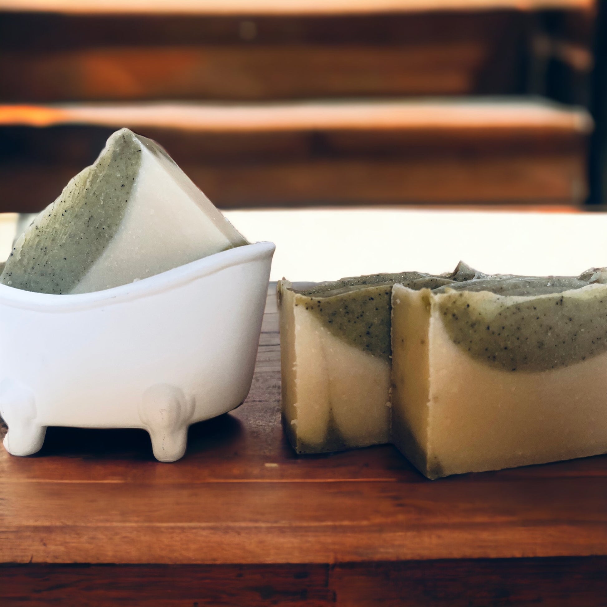 Introducing our artisan soap, "Meadow Mist", a unique and refreshing bar that is colored with wheatgrass and includes coffee grounds for a gentle exfoliation.